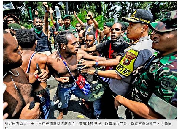 印尼首都雅加達廿二日也傳出學生示威,近百名西巴布亞學生戴著象徵分離主義的「晨星旗」頭帶,在市區街道、軍隊總部及總統府等地遊行,高呼「自由巴布亞」等口號,抗議種族歧視,鼓吹獨立自決,與警方爆發激烈衝突。