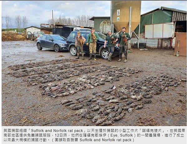 英國捕鼠組織「Suffolk and Norfolk rat pack」以天生擅於捕鼠的小型工作犬「諾福克㹴犬」,在英國東南部地區提供免費捕鼠服務,12日時,他們在薩福克郡埃伊(Eye, Suffolk)的一間養豬場,進行了成立以來最大規模的捕鼠行動。