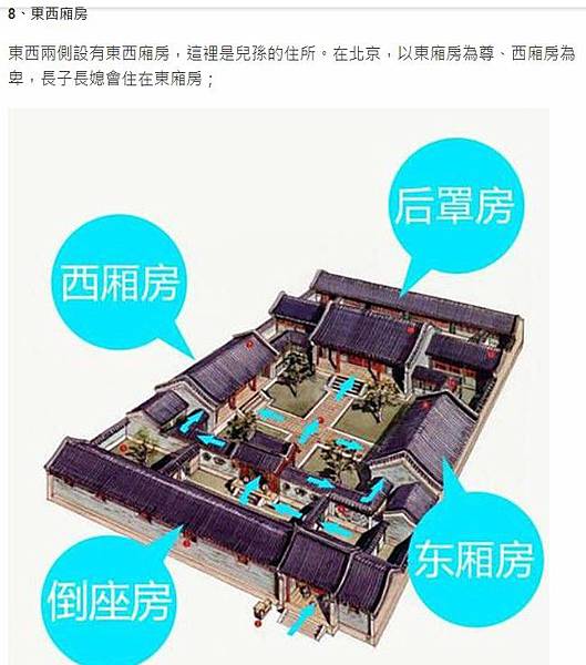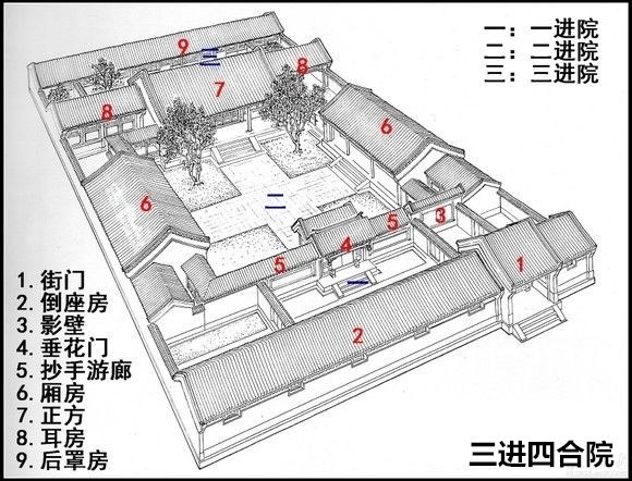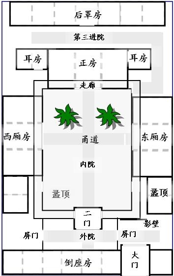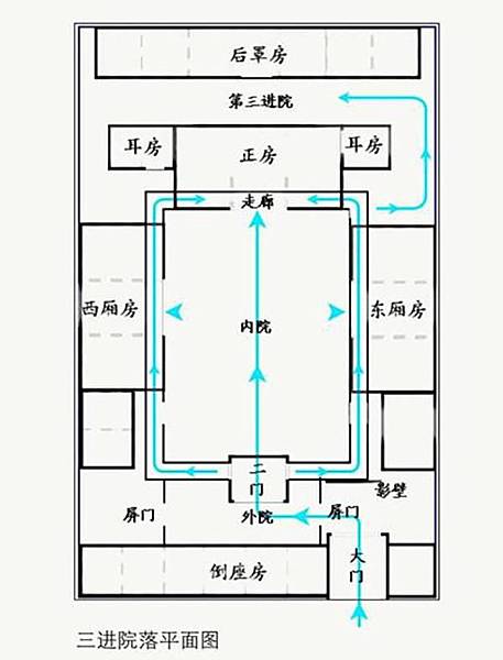 完整的四合院為三進院落,第一進院是垂花門之前由倒座房所居的窄院,第二進院是廂房、正房、遊廊組成,正房和廂房旁還可加[[耳房] ],第三進院為正房後的後罩房,在正房東側耳房開一道門,連通第二和第三進院。在整個院落中,老人住北房(上房),中間為大客廳(中堂間),長子住東廂,次子住西廂,傭人住倒座房,女兒住後院,互不影響。這其中也有反映“男外女內”的中國傳統文化哲學的影響。