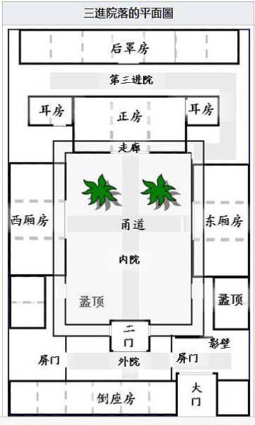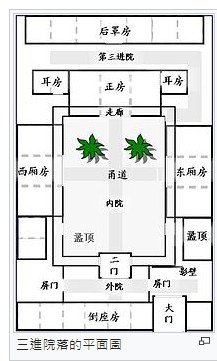 呈「日」字形則稱為「二進院落」,呈「目」字形則稱為「三進院落」。