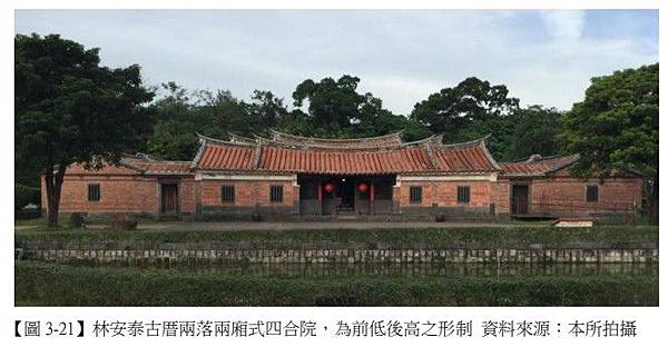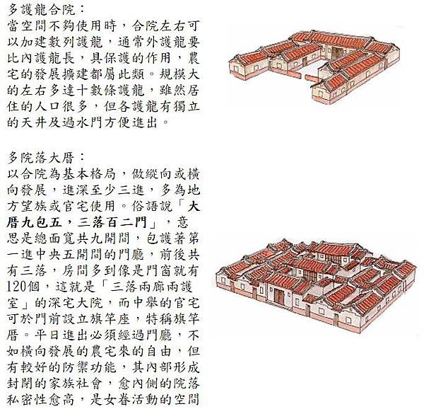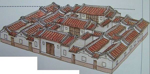 俗話說:「大厝九包五,三落百二門」,意思就是指面寬有九開間,包著第一進中央五開間的門,前後共有三落,房間多到光是門窗就有一百二十個! 一般而言,大宅院中第一進為門屋,第二進是廳堂,第三進為後進、私室或閨房,是婦女或眷屬的活動空間,一般人不得隨意進入……