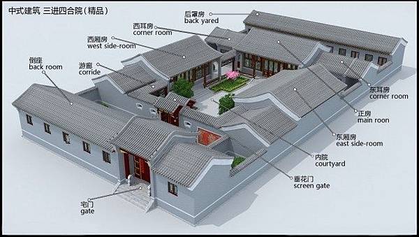 說起四合院,在中國的住宅建築裏,四合院是最具有中國特色的院落。四合院至少有3000多年的歷史,在中國各地有多種類型,其中以北京四合院為典型。四合院就是三合院前面又加門房的屋舍來封閉。若呈“口”字形的稱為一進院落;“日”字形的稱為二進院落;“目”字形的稱為三進院落。一般而言,大宅院中,第一進為門屋,第二進是廳堂,第三進或後進為私室或閨房,是婦女或眷屬的活動空間。四合院四面房屋圍繞,形成了比較隱密的庭院空間。