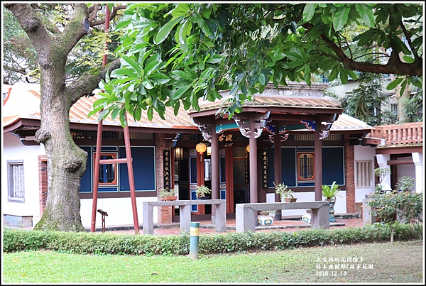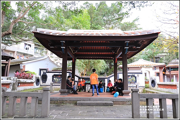 這個涼亭是重要的客人從「洗手間」方向的後門(進招待所總不會光明正大從大門進吧)進來之後可以休息的地方,不過值得注意的是後面的公寓,其實那邊應該要是林家的五落大厝(比三落大厝的規模更大),但是林家居住在板橋的後人並不是很發達,據許雪姬老師上課時講過,五落大厝裡好像還有人自殺的,而林家本是商人也急於開發這塊土地,所以在民國70年就採取把花園捐給政府,三落大厝留為祖廟,五落大厝拆掉蓋房子炒地皮賣錢的處理方案,許雪姬老師說原本城鄉所的夏鑄九老師在民國70年之前針對板橋的都市規畫建議就以林家的整個居住地為核心開發,這樣可以幫板橋保留下傳統文化和綠地,可惜鈔票總是文化比較值錢XD