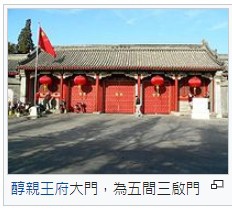 北京後海北岸的清醇王府(現中華人民共和國衛生部)大門,就是一座五間三啟門的屋宇式大門。 在封建社會,王府大門的間數、門飾、裝修、色彩都是按規制而設的。 如,清順治九年規定親王府正門廣五間,啟門三...... 綠色琉璃瓦...... 每門金釘六十有三...... 世子府門釘減親王九分之二,貝勒府規定為正門五間,啟門一。 位於後海南岸的清恭王府,原是乾隆帝的寵臣和坤的府邸,後來封賜給恭親王,這座王府的大門是三開間,上複綠色琉璃瓦。