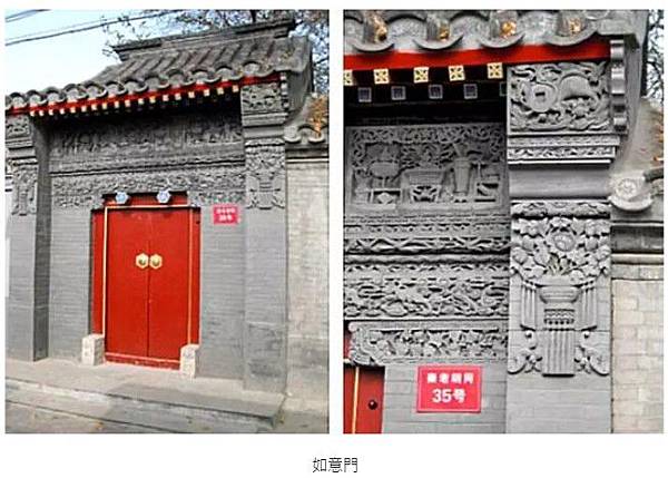 如意門 北京中小型四合院採用的大門當中,如意門占看相當大的數量。 如意門的門口設在外簷柱間,門口兩側與山牆腿子之間砌磚牆,門口比較窄小,門楣上方常裝飾雕鏤精緻的磚花圖案,在如意門的門楣與兩側磚牆交角處,常做出如意形狀的花飾,以寓意吉祥如意,故取名「如意門」。 如意門裡的住戶一般是在政治上地位不高,但卻非常殷實富裕的士民階層。 牆垣式門 除上述數種屋宇式大門外,在民宅中,採用牆垣式門者也不在少數。 牆垣式門最普遍、最常見的形式是小門樓形式,它的樣式儘管很多,但基本造型大同小異,主要由腿子、門楣、屋面、脊飾等部分組成,一般都比較簡單樸素,也有為數不多的豪華小門樓,門楣以上遍施磚雕,雖不氣派但卻十分華麗, 顯示房主人的富有和虛榮。北京文网--历史文化--四合院的宅门 http://bit.ly/31rYTP9