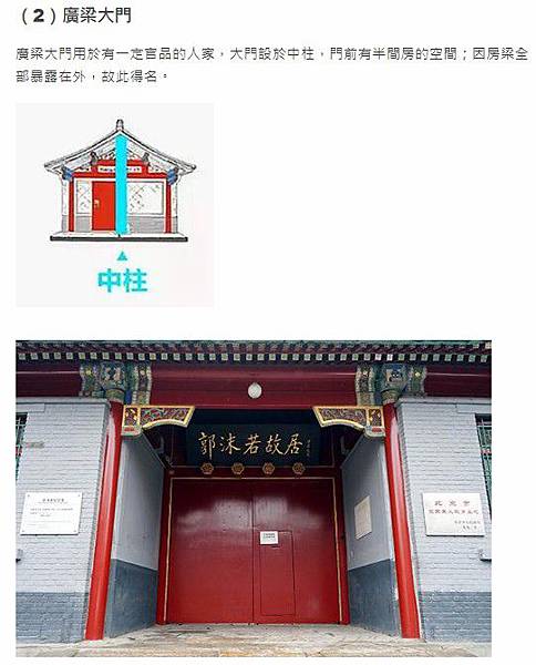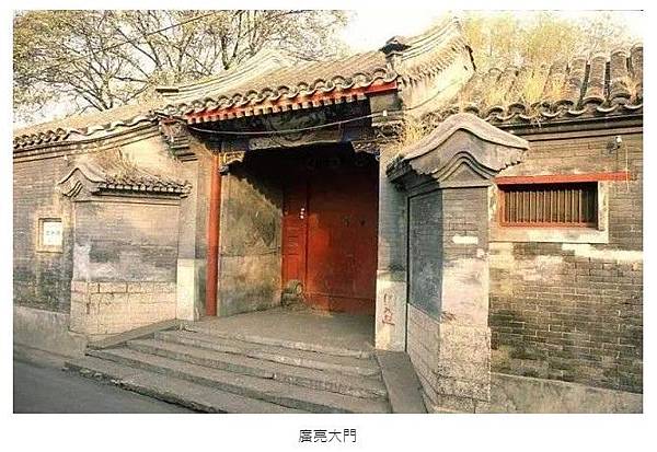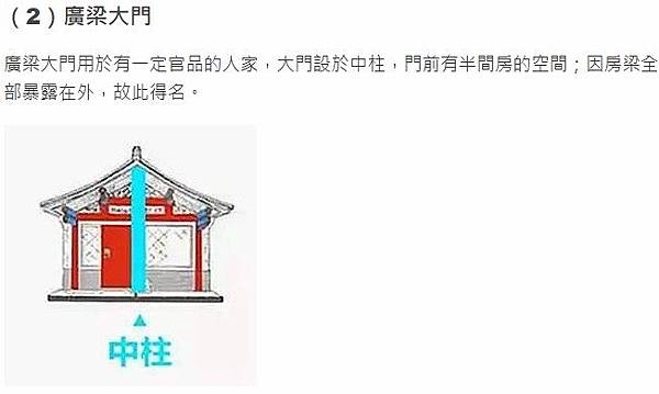 廣亮大門 廣亮大門僅次於王府大門,它是屋宇式大門的一種主要形式,這種大門一般位於宅院的東南角,佔據一間房的位置。 廣亮大門雖不及王府大門顯赫氣派,但也有較高的台基,門口比較寬大敞亮,門扉開在門廳的中柱之間,大門簷枋之下安裝雀替、三幅雲一類既有裝飾功用,又代表主人品級地位的飾件。