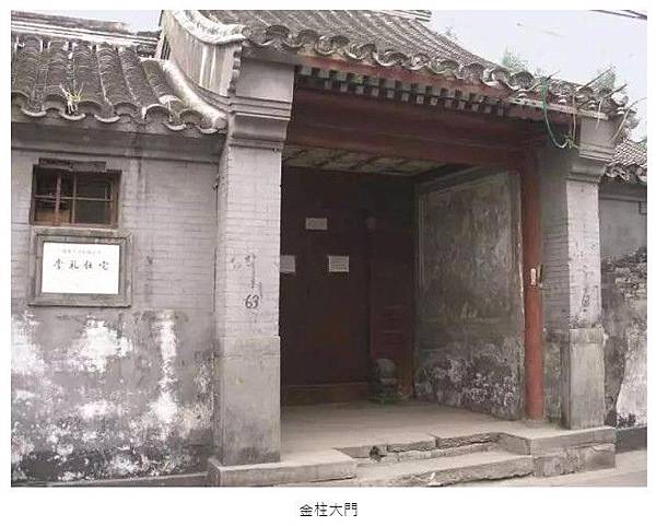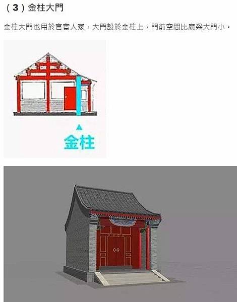 金柱大門 這是一種門扉安裝在金柱(俗稱老簷柱)間的大門,稱為"金柱大門",這種大門同廣亮大門一樣,也佔據一個開間,它的規制與廣亮大門很接近,門口也較寬大,雖不及廣亮大門深邃莊嚴,仍不失官宦門第的氣派, 是廣亮大門的一種演變形式。