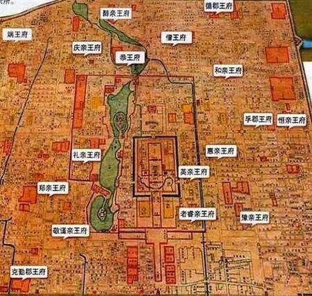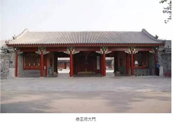 清朝順治九年(1652年)規定,親王府大門為五間三啟門,用綠色琉璃瓦,63顆金門釘,世子府大門有45顆門釘,貝勒府大門規制次之。