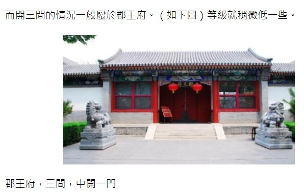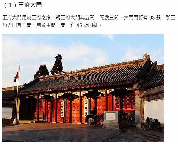 最高等級的,便是「王府大門」,顧名思義,用於王府,王府大門並不單單是一扇門,嚴格來講,它也算是一座建築物,通常有三間一啟門和五間三啟門兩個等級,門上有門釘。(其實還有一個比它更高級的)