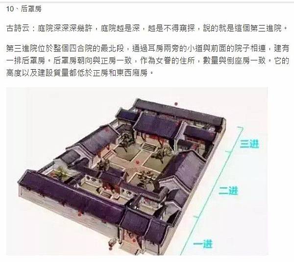 就一般而言,一進為門屋,二進為廳堂,三進為閨房。其中「閨房」就是女眷或者婦女的進出私房,因此不得窺探。這跟早期的封建社會也是有很大關聯的。