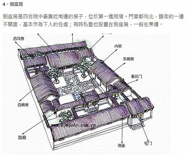 最小的一進院,進了街門直接就是院子,以中軸線貫穿,房屋都是單層,由倒座房、正房、廂房圍成院落,其中北房為正房,東西兩個方向的房屋為廂房,南房門向北開,故稱為“倒座房”。四合院中植花果樹木,以供觀賞。