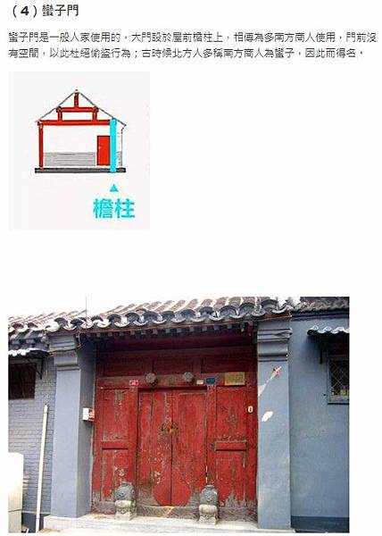 蠻子門 如將廣亮大門或金柱大門的門扉安裝在外簷柱間,門扇檻框的形式仍採取廣亮大門的形式,北京人把這種門稱為「蠻子門」,它是廣亮大門和金柱大門進一步演變出來的又一種形式。