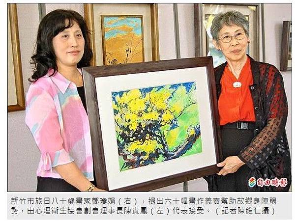 新竹市旅日八十歲畫家鄭瓊娟(右),捐出六十幅畫作義賣幫助故鄉身障弱勢,由心理衛生協會創會理事長陳貴鳳(左)代表接受。(記者陳維仁攝)