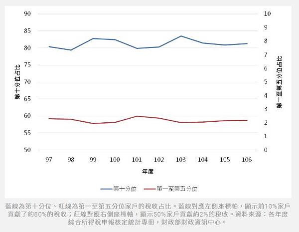 藍線為第十分位、紅線為第一至第五分位家戶的稅收占比。藍線對應左側座標軸,顯示前10%家戶貢獻了約80%的稅收;紅線對應右側座標軸,顯示50%家戶貢獻約2%的稅收。資料來源:各年度綜合所得稅申報核定統計專冊,財政部財政資訊中心。