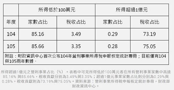 所得超過1億元之營利事業占比(%)。表格中可見所得低於100萬元者在所有營利事業家數中高達85.16% 與85.66%,稅收貢獻分別為3.49%與3.35%;超過1億元事業家數占比則分別為0.29%與0.28%,稅收貢獻則為73.19%與75.05%。資料來源:營利事業所得稅申報核定統計專冊,財政部財政資訊中心。