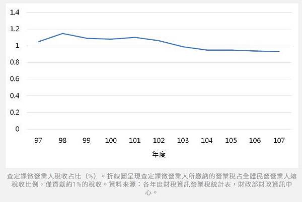 查定課徵營業人稅收占比(%)。折線圖呈現查定課徵營業人所繳納的營業稅占全體民營營業人總稅收比例,僅貢獻約1%的稅收。資料來源:各年度財稅資訊營業稅統計表,財政部財政資訊中心。