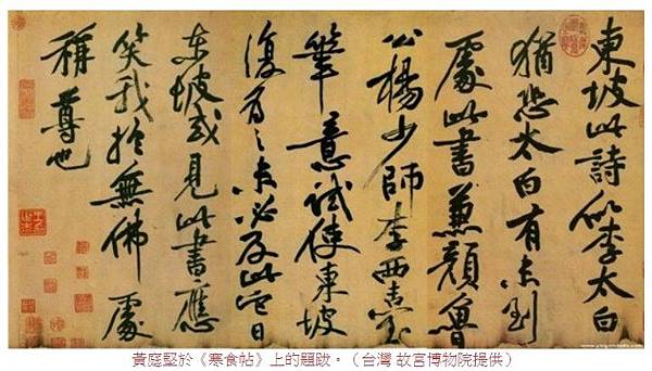 黃庭堅於《寒食帖》上的題跋。(台灣 故宮博物院提供)