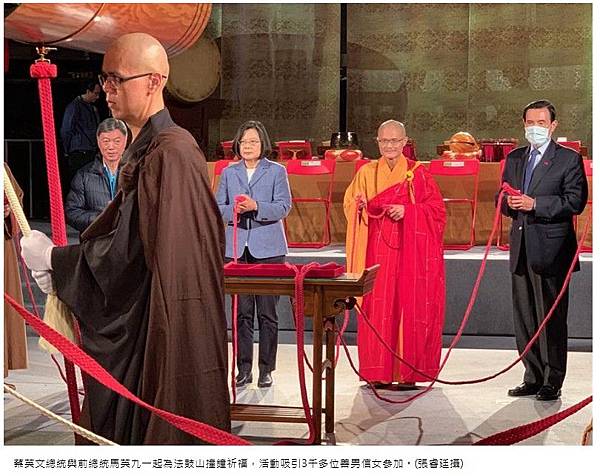 法鼓山「除夕撞鐘祈福法會」,總統蔡英文、前總統馬英九三度同台,但武漢疫情爆發,只見馬英九戴口罩。(法鼓山提供)
