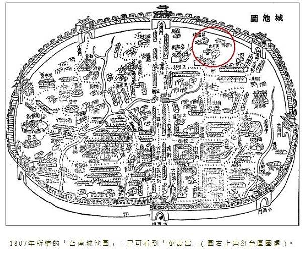 1807年所繪的「台南城池圖」,已可看到「萬壽宮」( 圖右上角紅色圓圈處 )。
