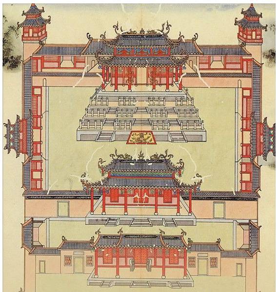 台南府城「萬壽宮」萬壽亭是康熙 50 年(1711)時,臺廈道陳璸為了慶賀二年後的皇帝六十大壽而倡建;六年後,臺廈道梁文科又以「規制弗完,恐褻君恩」,會商地方文武共同捐資擴建,「於午門之外,闢東闕、西闕廊房,左右建朝房兩班,共十四間;周圍環壁,四顧井然。東樹敷文門、西樹振武門,南面高築霓臺,以肅巨觀。於龍亭之後,又建祝聖殿一座,阿護帝廷。東西配殿增營十一間,兩旁僧舍四間。」萬壽亭也成為十八世紀上半葉臺灣地方文武官員舉行朝賀儀式之所。56 《臺灣府志》載:凡遇皇帝生日以及元旦、冬至,文武各官在前一天就要沐浴齋戒,率領屬員到府學的明倫堂排練禮儀。儀式舉行當天,四鼓時穿好正式朝服,一齊到萬壽亭集合。由海防同知擔任「糾儀官」;文武分列東西,行三跪九叩禮。皇帝聖壽前後三天,文武各官都要穿戴整齊的朝服,五鼓到萬壽亭坐班。57 我們可以看得出來,位於府城的萬壽亭,等於清朝皇帝的化身,駐臺文武官員於每年固定時節聚集在此朝拜。58 康熙 60 年朱一貴事件時,義民們供奉「皇上萬歲聖旨牌」一路往府城前進,最後將萬歲牌安置在萬壽亭,看來是相當合理的舉動,因為萬壽亭是臺灣當時最符合皇帝身分的地方。59 地方文武官員在任所集會慶祝皇帝誕辰,是來自於朝廷規範的禮儀。光緒《續修大清會典》載有「各省三大節朝賀之禮」,規定:各省地方官凡逢元旦、萬壽聖節、冬日三大節,必須「拜龍牌而慶賀」: 省會及各府、州、縣,豫於公所正中,恭設皇帝萬歲萬萬歲龍牌於亭,南嚮。設香案於亭之南。是日五鼓,有司設燎於庭,設鐙於門廡。省用道員或府同知一人,府用同知或通判,如無同知、通判,用教官一人,州縣均用教官一人,糾儀。學生員二人通贊,二人引班。省會班次,將軍、總督、加將軍銜提督為一班……漢官文東武西立位……各行三跪九叩,禮畢,引退。府不附省,縣不附府者,文武官於公所,按班行禮,均如省會儀。60臺灣方志所載文武官員在萬壽聖節舉行的慶賀之禮,大致上符合會典的規定,唯一沒有清楚說明的是,儀式舉行前要「恭設皇帝萬歲萬萬歲龍牌於亭」。《大清會典》中的「亭」,應該是指萬壽亭這個建築群(設施)內的龍亭。康熙末年出版的《臺灣縣志》之萬壽亭建築配置圖,即繪有龍亭的獨立建築。61 「龍亭」在地方官和皇帝權力接觸的場合,時常會出現。例如,《臺灣府志》也記載所謂「接詔禮」:當運載皇帝詔書的船隻抵達府城外的鹿耳門時,各文武官員要準備「龍亭、綵輿、儀仗、鼓樂」等,到西門外的接官亭迎接。將詔書移奉「龍亭」,座北朝南,而文武官員穿著朝服,北向跪迎。隨後在鼓樂的前導下,進入明倫堂。展讀官在地方官員行三跪九叩禮後,從龍亭中請出詔書,當著跪在地上的官員面前宣讀詔書。讀完之後,再將詔書捧置於龍亭。62 這裡的龍亭看來並不是類似萬壽亭的建築,而是一種木造、可移動的器具,有點類似神龕或轎子;裡面供奉皇上萬歲牌位。63 從這些跡象看來,康熙 50 年代為了慶祝皇帝萬壽而修建的萬壽亭,在龍亭之內原本應該也有安置萬歲牌。乾隆 16 年(1751),臺灣知縣魯鼎梅以萬壽亭位於城外、行禮不便,詳請將地方三節慶賀禮改在府城明倫堂舉行時,曾說:「郡庠明倫堂業經更新鼎建,規制寬敞,內庭有奎光閣,峻聳輝煌,堪以安奉龍牌」,說明原先慶賀的場所最重要的就是擺置龍牌。