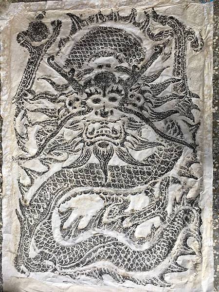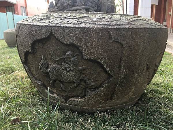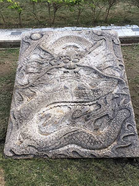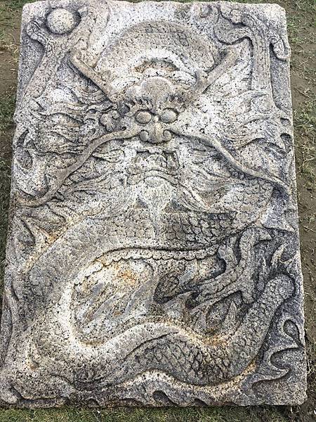 「萬壽宮」遺物。圖中刻有龍形圖案的「御路」和「石鼓」,