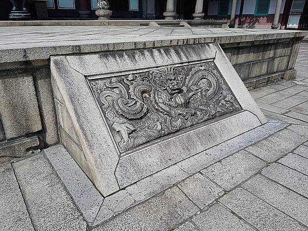螭ㄔ陛又稱御路,是皇帝專用的圖騰,用於宮殿的台階。螭陛龍首朝前,手握龍珠,氣勢威猛,象徵皇帝的威儀,也彰顯出建築物的重要性。 這階梯古時不准一般人行走,只有新科狀元或是皇帝祭孔等特殊情況才能使用-[萬壽宮構件]第一代臺南地方法院(即清代萬壽宮與臺灣縣學)的構件,如萬壽宮螭陛、石鼓、柱珠等石材遺構,雕工精美講究,花草動物造型生動,在在彰顯出萬壽宮的重要價值。