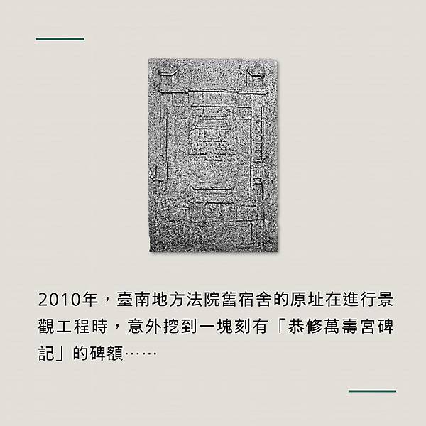 2010 年,地方法院舊宿舍的原址在進行景觀工程時,意外挖到一塊刻有「恭修萬壽宮碑記」的碑額,推測其應該原屬於碑記的一部分。