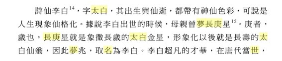 驚姜之夕,長庚入夢,故生而名白,以太白字之。世稱太白之精,得之矣。(李陽冰〈草堂集序〉)