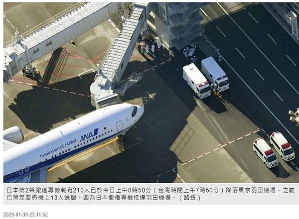 日本 ─ 日本政府專機昨天將200名左右日籍公民帶離武漢、返回東京;今日載有210人的第2架撤僑專機已於上午8時50分(台灣時間上午7時50分)降落東京羽田機場,相關機構透露在之前已預定要將機上13人送醫。