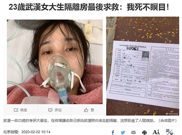 23歲武漢女大生隔離房最後求救:我死不瞑目! http://bit.ly/36SoMII