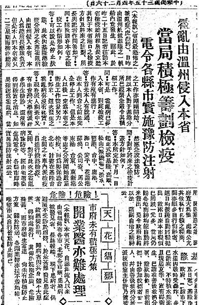 1946年,中華民國政權接管臺灣幾個月,原本已絕跡的各式傳染病又開始盛行,人心惶惶。圖中之新聞,為當年四月發生中國溫州來臺船隻爆發疫情,民報記者詢問「檢疫總所所長」程立對於疫情防治之答覆。程立表示當時臺灣檢疫工作「可以說是停止狀態」「大家要我負責但我才剛到任」並表示「以後一定為本省之衛生工作盡量努力」