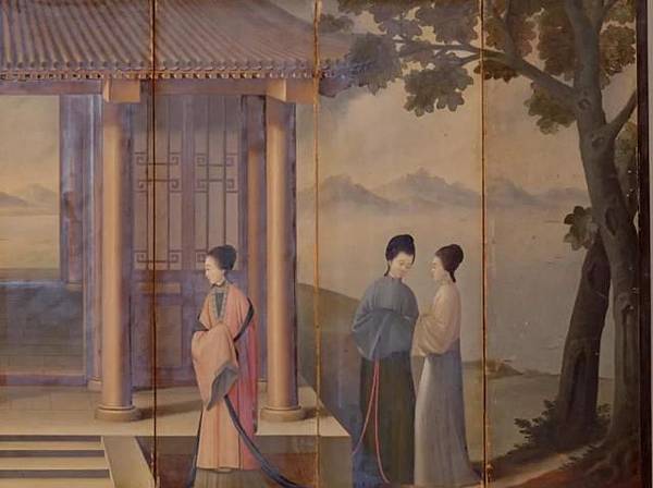 屏風的另一面為一幅通景的油畫仕女圖,也是絹地。 畫的最右面是兩棵梧桐樹,粗壯的枝幹,綠色濃密的樹葉,樹下有兩年輕婦女,邊走邊談,神態悠然,其中一女子穿白色上襦,著灰色長裙,另一女子穿藍色上衣,著深赭色長裙,紅色衣帶飄在裙前。 畫面正中為一大廳,建于一平臺上,立面共四柱,柱有柱礎;屋頂上覆筒瓦,廳前有抱廈,廳中門大開,兩邊是帶有花紋的隔扇門。 廳內方磚墁地,整齊平淨。 廳外地上站一年輕婦女,身穿粉紅色連衣長裙,右手置於胸前,肩臂處繞一深綠色飄帶;廳堂門內,也站立一年輕女子,身穿綠色連衣長裙,右手彎曲至胸前,持一柄摺扇。 廳堂後門亦大開,隱約可以望見屋後遠處的坡岸、湖水和青山。 廳堂之左為一木板小橋,橋上站立婦女三人,一人穿連衣長裙,二人著粉紅色短裙,正在互相談笑,橋下水中立一巨石。 過木橋,又有一座臨水的建築,畫面到此為止。