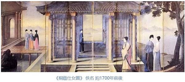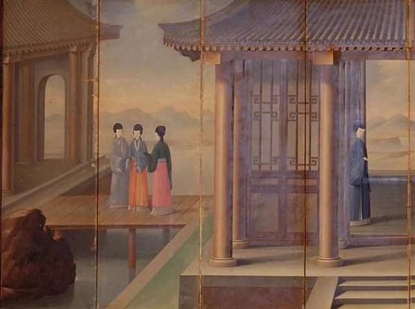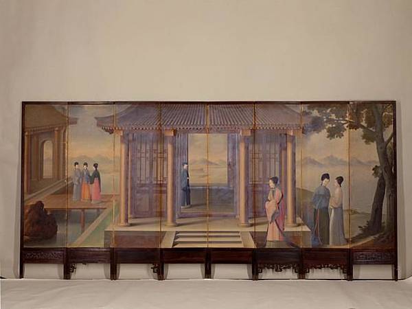 此幅繪製於清朝康熙時期,出自中國宮廷畫家之手,是目前所見最早的中國油畫作品之一。作者在圖中完全採用西洋油畫手法描繪了一座典型的中國傳統木構建築,其中不僅運用了明顯的焦點透視法以增強畫面的縱深感,而且極力通過光線照射所產生的高光與投影的強烈明暗關係來表現建築的立體感,雖然技法尚顯稚拙,但無疑是一種新的嘗試,為中國傳統建築畫注入了新的表現形式和技法。 桐荫仕女图屏 - 故宫博物院