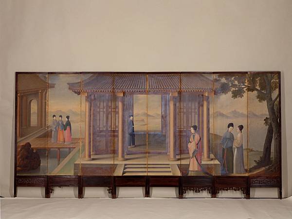 《桐蔭仕女圖》屏,8扇屏面,清,絹本,設色,縱128.5cm,橫326cm。