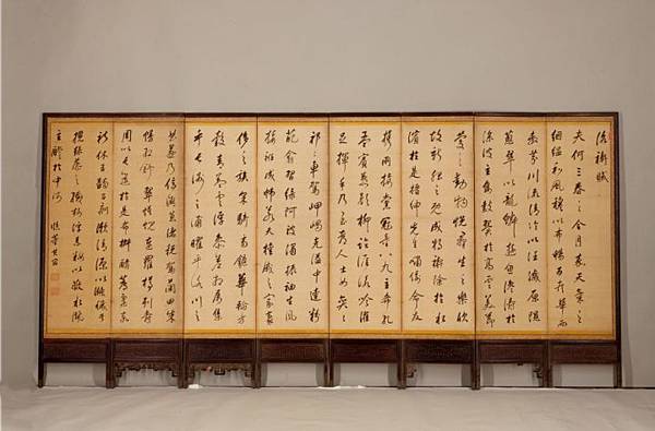 本幅無款印。屏風背面為康熙皇帝臨董其昌書《洛禊賦》全文,鈐「日鏡雲伸」、「康熙宸翰」、「敕幾清宴」3印。