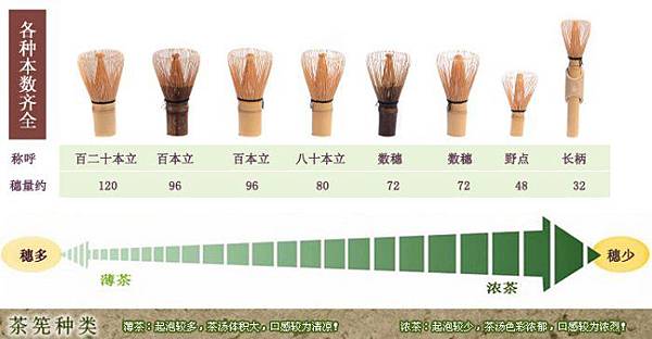 以竹子製成,內外各有六七十根到上百根的細枝,可用來充分打散抹茶,以免細粉被水包覆結塊,並打出細緻的泡沫,使抹茶的風味完全散發。