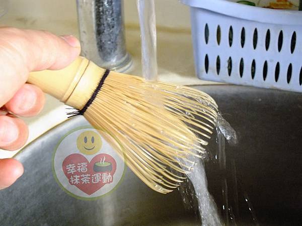 至於使用茶筅點茶後的清洗,只要馬上拿去水龍頭下沖水 (上圖),就能清潔乾淨,不需特別的處理。但是如果放久了,綠色的抹茶粉末和色素就比較難沖水就掉,可能需用手輔助 (兩根手指抓住分枝往尾端輕拉擦拭)。