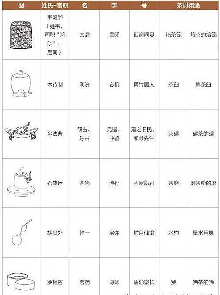 南宋末年的《茶具圖贊》便是這「抹茶盛世」裡的一個文化結晶。 其作者「審安老人」的真實身份已不可考,但書裡富於創意的「十二先生」確屬中國茶道、儒家文化、宋代士人階層娛樂的經典結合——十二種抹茶器具被取上了姓、名、字、號,並依據宋朝官制被加封了各自不同的官職。 本文取其精要,依使用次序和分工(烤茶、磨粉、篩集、備湯、入盞、打拂)將每位「先生」的姓氏和頭銜羅列于下: