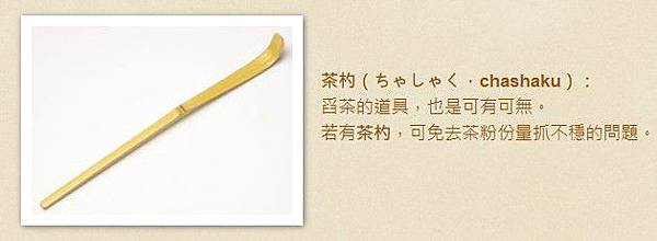茶杓:木製茶杓,用來挖出抹茶粉來。可以用普通的湯匙替代。