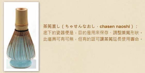 茶筅:茶筅是用來刷抹茶的道具,喝抹茶唯一需要的特規道具,是消耗品。有分竹製與塑膠製。竹製都會是手工製作,因此價格較高,當然也有分產地,有來自中國、韓國、日本等。塑膠茶筅,比較不容易壞掉。除了產地的分別,使用的竹子也有所差異,有分煤竹、白竹、黑竹等不同的竹材。