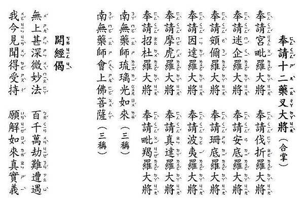 此十二藥叉大將。一一各有七千藥叉。以為眷屬。同時舉聲白佛言。世尊。我等今者。蒙佛威力。得聞世尊藥師琉璃光如來名號。不復更有惡趣之怖。我等相率。皆同一心。乃至盡形歸佛法僧。誓當荷負一切有情。為作義利。饒益安樂。隨於何等。村城國邑。空閑林中。若有流布此經。或復受持藥師琉璃光如來名號。恭敬供養者。我等眷屬衛護是人。皆使解脫一切苦難。諸有願求悉令滿足。或有疾厄。求度脫者。亦應讀誦此經。以五色縷。結我名字。得如願已。然後解結。