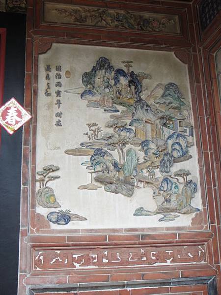 室內特徵 前落隔斷牆構架屬「疊斗式」之七架厝,架內為「二通三瓜」,即兩枝通樑,三個瓜筒。牆面以板壁入堵,分割為數個堵面。檐廊以屐承挑檐檁,凹壽出檐之七架檁及挑檐置於實牆上,後檐牆之挑檐檁則自虎口柱作出屐承檐。