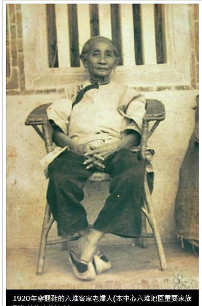 清代光緒年間《新竹采訪冊》〈客莊風俗〉中有非常明顯的記載:「婦女皆赤腳,肩挑背負,服勞與男子同。」其中記錄了客家婦女在工作時都是打赤腳,能挑重擔、田間操勞,和男子一樣,決沒有軟弱女子的態勢。在日據時代,大正9年(1920)出版的《現在?臺灣》也更清楚的記載,台灣本島的廣東(客家)和福建(閩南)婦女的差異,其中罪明顯的是:「廣東婦女一雙大腳、又裸足,體格強健能下田從事庄稼勞動---。」(後藤朝太郎,1920:37)