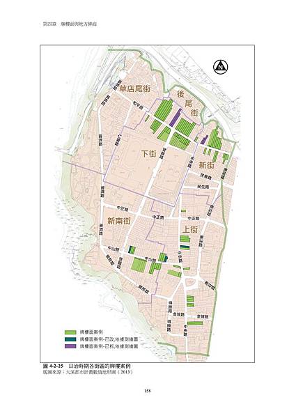 大溪的聚落發展遂延著<通議第> 外圍而開展,上街及下街遂發展為今日的中山,中央及和平老街