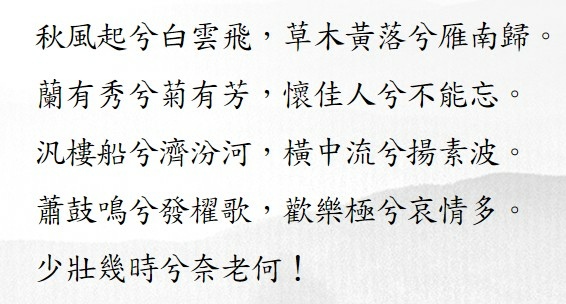 在山西省萬榮縣城西南40公里,汾河匯入黃河之處,矗立著一座后土廟。漢武帝最先在此設立后土祠,並且多次來這裡祭拜,留下了著名的《秋風辭》:「秋風起兮白雲飛,草木黃落兮雁南歸。蘭有秀兮菊有芳,懷佳人兮不能忘。泛樓船兮濟汾河,橫中流兮揚素波。簫鼓鳴兮發棹歌,歡樂極兮哀情多。少壯幾時兮奈老何!」