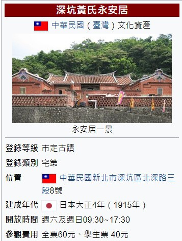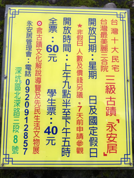 深坑「黃氏永安居」,於1915年建造完成,定為三級古蹟。因為屬私人財產,還有黃氏後代居住當中,平日並不對外開放,只有週末假日或接受預約,而且有每日最多200人的限制。