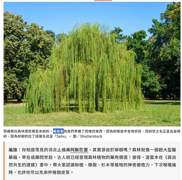 編按:你知道常見的消炎止痛藥阿斯匹靈,其實源自於柳樹嗎?森林就像一個超大型醫藥箱,早在成藥問世前,古人就已經發現森林植物的藥用價值!彼得・渥雷本在《與自然共生的證據》書中,帶大家認識柳樹、橡樹、杉木等植物的神奇療癒力,下次喉嚨痛時,也許你可以先來杯橡樹皮茶。