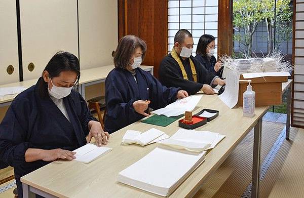 日本京都世界遺產仁和寺宣布,對一般民眾參拜藥師如來發放「特製口罩」,用和紙手工摺疊穿線製成,上面印有代表救人於苦難的藥師如來印記,寺方表示,「特製口罩」原本只在宗教儀式上使用-「特製口罩」長9公分、寬20公分,用被稱作「奉書紙」的和紙6摺製作而成,僧侶也會在上面打洞穿線,讓口罩可以掛在耳朵上。奉書紙上印有藥師如來的梵文印章,這樣的「特製口罩」原本被稱作「覆面」,是僧侶到佛前獻花時使用,為了「掃除身上不乾淨的氣息」而使用。仁和寺吉田正裕執行長表示,「特製口罩」從3月1日開始對參拜者免費發放,由僧侶和寺方職員手工製作,包含摺紙、蓋章、打洞和穿線 https://is.gd/JcFAms![]()