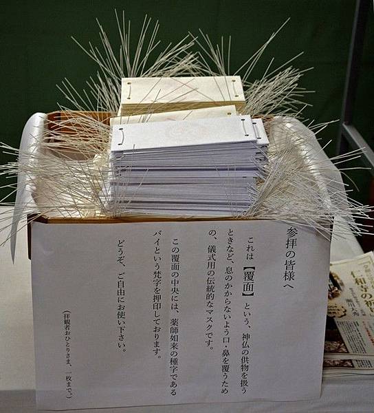 報導指出,這些覆面由寺中僧侶及工作人員純手工製作、費時較長,每日僅能製作約200個,完成後,僧侶會將它們供奉於藥師如來像前祈求祝福。