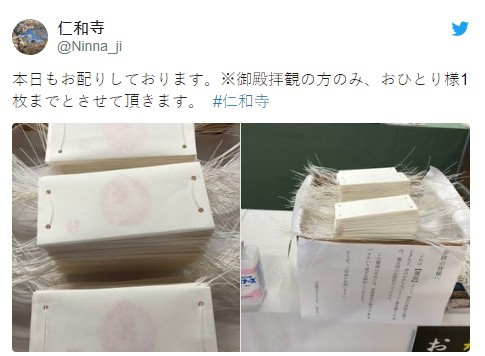仁和寺每日發放約200個限量「純手工口罩」給參拜民眾。(圖擷取自仁和寺推特 @Ninna_ji)